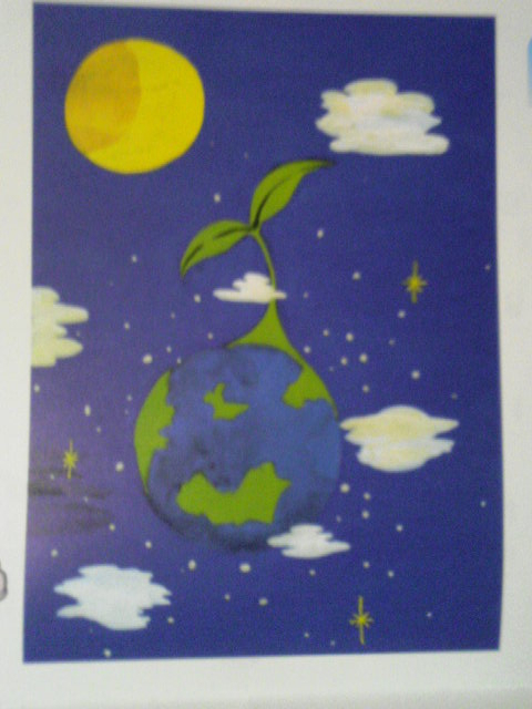 我がビューティー姪っ子の描いた絵が某企業の環境コンクールに入選し、2009年カレンダーの一枚になりました。我がビューティー姪っ子は、若干中学一年生ながら私より身長は高く、私より手足も長く、見た目は完全にビューティOL。趣味は読書。少女漫画から6000円もする分厚い神話まで、その許容範囲はかなり広い。普段から言葉少なく落ち着いた物腰。的確な判断。すでに小学校高学年でクラスの揉め事を担任から相談されることが度々。おかげで今は学級委員。が、本人は目立つのがキライ。物事の本質を鋭く見極め、若干斜45度からモノを見るクセあり。そのため彼女の中では、年に一度運動会でついつい本領を発揮してしまう猫まっしぐらタイプの連中の事は理解に悩むらしい。そして世間では、そんな彼女の事をこう呼ぶだろう。『ナ・マ・イ・キ』。ま、そんな彼女も私にとっちゃビューティー姪っ子。ビューティーは、ほんと。べっぴんさん。いったい誰に似たかしら?そんな家族の中でもちょっと不思議オーラをかもし出す彼女の描いたこの絵。なんてこった。びっくらこいた。やっぱり6000円する本を熟読してるだけあるな。いやいや、なんというか、彼女の頭の中の美しさというか、今まさに猛スピードで色んな事を吸収している中学一年生である彼女の知識や感性、思い、葛藤、願望、それらが溢れ出ているというか。本人はどう思っているか知らないが、なんだか私にはとても美しく見える。絵を通して、彼女自身がとても美しく見える。世間はクリスマス。浮き足立つ世の中を、彼女は今日も斜45度から見ているだろう。メリー・クリスマス。