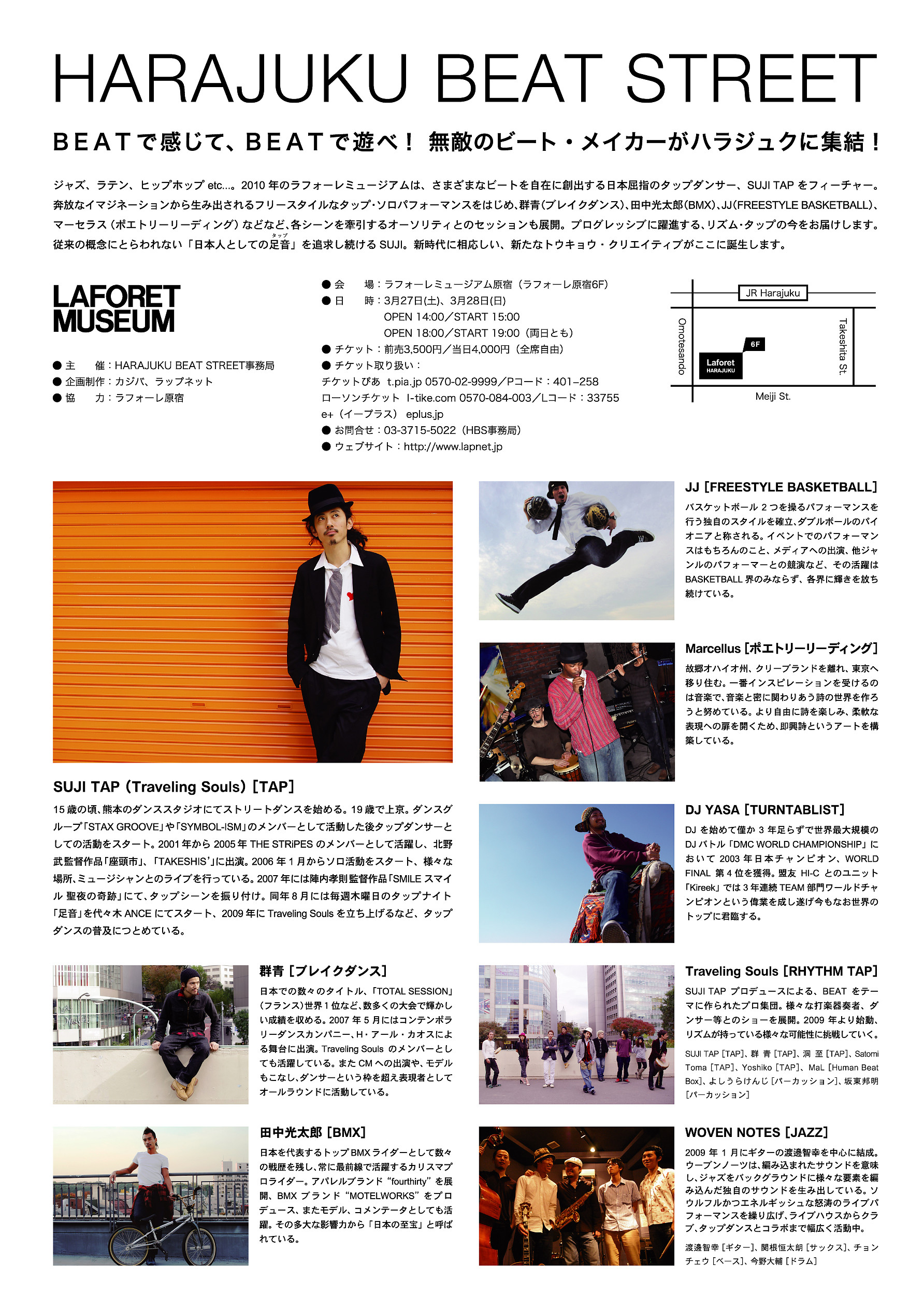2010年、いよいよTraveling Soulsが大きく飛躍します!まずは原宿ラフォーレ。見逃さざるべし。乞う御期待!*チケットお問い合わせ等は、各プレイガイド又はsatomiまでどうぞ。CM=click here!http://www.youtube.com/watch?v=BxutyzxdhkA Traveling Souls(tap) From club ASIA 2009.12.22 YouTube【 HARAJUKU BEAT STREET 】BEATで感じて、BEATで遊べ! 無敵のビート・メイカーがハラジュクに集結!■出 演:Traveling Souls [SUJI TAP、MaL、よしうらけんじ、坂東邦明、群青、洞至、Satomi Toma 、Yoshiko][TAP、BREATH、Percussion]、群青[ブレイクダンス]、田中光太郎[BMX]、JJ[FREESTYLE BASKETBALL]Marcellus[ポエトリーリーディング]DJ YASA[TURNTABLIST]WOVEN NOTES[Jazz]■会 場:ラフォーレミュージアム原宿 [ラフォーレ原宿6F]■日 時:2010年3月27日(土)、28日(日) 2日間14:00 OPEN 15:00 START18:00 OPEN 19:00 START■チケット:前売/3500円 当日/4000円※日時指定・全席自由■チケット発売日:1月16日(土) ※e+のみ2009年12月28日■取り扱い:チケットぴあ Pコード: 401-258TEL: 0570-02-9999http://pia.jp/t/ローソンチケット Lコード: 33755TEL: 0570-084-003http://l-tike.com/e+(イープラス)http://eplus.jp(PC・携帯電話 共通)■お問合せ:03-3715-5022[HBS事務局]■ウェブサイト:http://www.lapnet.jp (1月15日から情報アップになります)
